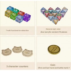 Contém 7 (sete) dados de 6 lados; 10 (dez) Elemental Dice de 8 lados; 3 (três) Character Counter; e 1 (uma) coin.